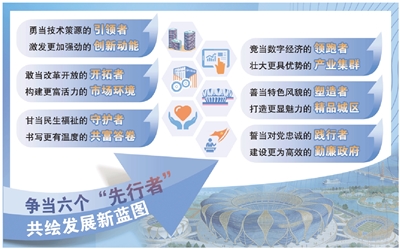 在改革开放上“敢当开拓者”。积极探索首创性、差异化改革,大力营造“三个最”开放环境,推动资源配置效率最优化和效益最大化。比如, 深入实施自贸试验区提升战略,做强数据跨境服务中心,持续完善外籍跨境电商人才综合服务平台,推进外国人永久居留申请县(市、区)预受理试点建设;大力推进“14+19+N”项重大改革,持续迭代“1+X+N”产业政策体系,深化“高效办成一件事”,深化知识产权运营服务,打造知识产权服务贸易港核心区。深化“改革沙盒”试点,加快构建数据要素、直播等产业“法治+”增值服务网络。