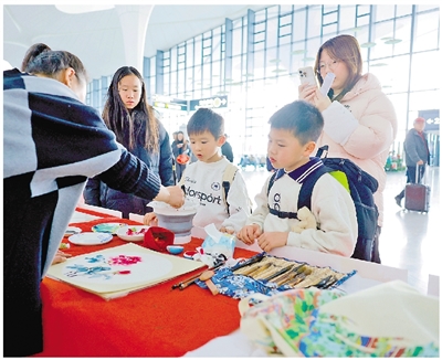 体验区内,旅客张女士正小心翼翼地在漆扇上勾勒图案:“以前只在电视上看过漆扇制作,没想到今天能亲手尝试!”旁边,一位小朋友正专注地为漆画上色:“我要画一个大太阳,让新年每天都暖暖的!”