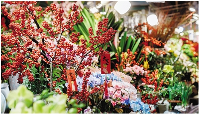 各色年宵花挂上了喜庆装饰。记者 王毅 摄