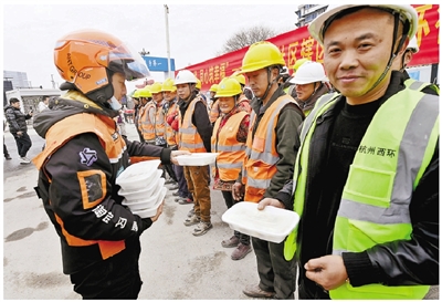 “我们很多外卖小哥今年也不回老家,特别能体会在外过年的心情。”望着眼前戴着安全帽的工友,彭清林很能感同身受:“风里来雨里去,咱们都一样,就希望能为他们出点力。以后这样的‘订单’,我们还想多送几趟。”