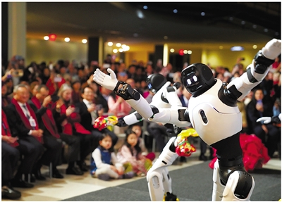 2月12日晚,由联合国中国书会主办的“骏驰八秩,春煦五洲”主题春节联欢晚会在纽约联合国总部举行。500多位中外嘉宾欢聚一堂,共迎马年新春。图为智能机器人在晚会上表演舞蹈。 新华社记者 张凤国 摄