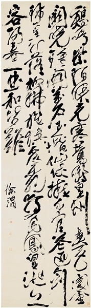 西泠印社所藏最长的书法卷轴,当数徐渭的《草书七律轴》。卷长3.53米、宽1.04米,所书为唐代岑参《奉和中书舍人贾至早朝大明宫》诗句:“鸡鸣紫陌曙光寒,莺啭皇州春色阑。金阙晓钟开万户,玉阶仙仗拥千官。花迎剑佩星初落,柳拂旌旗露未干。独有凤凰池上客,阳春一曲和皆难。”宣纸之上,墨迹纵横恣肆,跨越五百载春秋,向观者无声诉说着这位“畸才”的一腔野逸,满腹才情。