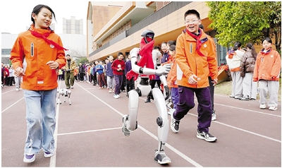 奥体实验小学的学生与机器人一起开启新学期首跑。学校供图