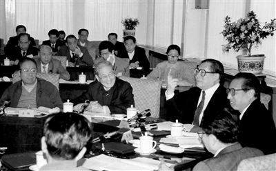 1991年4月,江泽民同志、宋平同志(前排左二)等与参加党建理论讨论会的代表座谈。新华社发