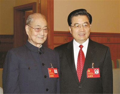 2007年10月21日,在党的十七大闭幕前,胡锦涛同志同宋平同志在一起。新华社发