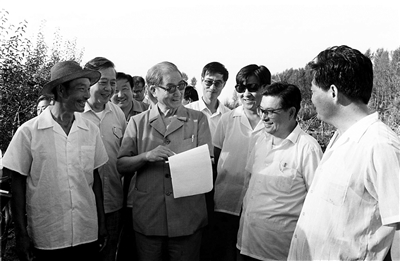 1990年7月中下旬,宋平同志(前左二)来到内蒙古自治区巴彦淖尔市临河区马场地村了解基层党支部建设情况。 新华社记者 施长江 摄