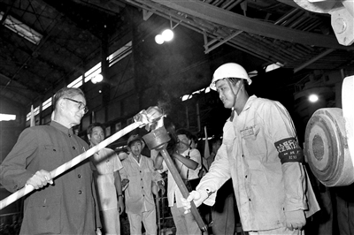 1985年9月15日,我国第一座日产万吨铁的高炉——宝钢一号高炉点火试生产。这是宋平同志(左一)为高炉点火。 新华社记者 张平 摄