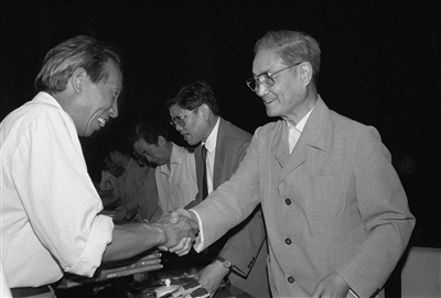 1991年6月26日,中共中央组织部、中共中央宣传部等单位在北京召开大会,表彰全国高校优秀思想政治工作者。这是宋平同志(右)向获奖的个人颁奖。 新华社记者 张燕辉 摄