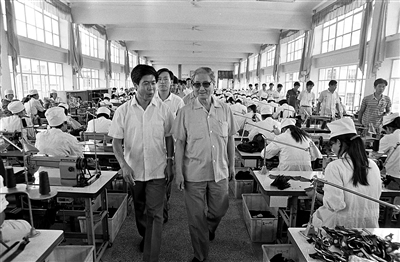 1990年8月14日,宋平同志(右)在山东省威海市文登区考察。 新华社发