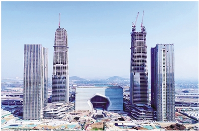 目前,各建筑建设正有序推进。除A塔楼外,B塔楼正在进行顶部钢结构安装。C、D塔楼外立面幕墙施工完成90%,室内装修与机电安装正在同步推进。