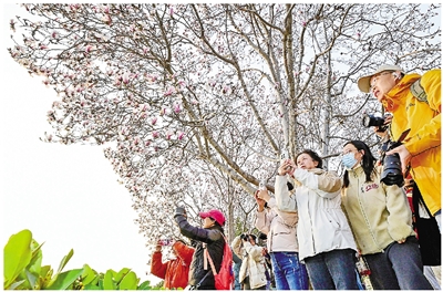 图为近日,众多摄影爱好者在国家大剧院旁拍摄玉兰花。日前,北京街头的玉兰花悄然盛开,为城市添上一抹靓丽的春色。 新华社发