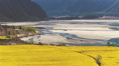 易贡油菜花田位于西藏林芝市波密县易贡乡。近期,这里连片油菜花竞相开放,桃花也缀满枝头,与远山相互映衬,构成一幅高原田园画卷。图为3月20日拍摄的西藏林芝市波密县易贡乡的油菜花田。 新华社记者 普布次仁 摄