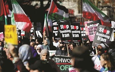 3月21日,人们在英国伦敦参加集会,抗议美国和以色列对伊朗发动军事打击。新华社记者 李颖 摄