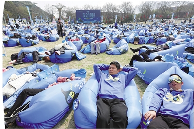 当天,在郡安里10000平方米的大草坪上,1000张蓝色的充气沙发整齐铺开。随着主持人“3,2,1,睡!”的指令,1000名参赛者同时入睡。