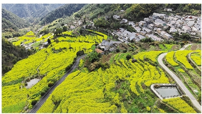 近日,建德市乾潭镇邵家村胥岭自然村的500亩梯田油菜进入盛花期,黄灿灿的油菜花从山脚延伸到了岭尖,蔚为壮观,与错落有致的村落民居构成一幅春日山乡的立体画卷,吸引各地游客纷至沓来。胥岭自然村是一个有着2500余年历史的古村落,近年来,该村以农文旅融合促进山村经济和全域旅游发展,走出一条共同富裕的“古道新路”。通讯员 宁文武 摄 记者 李忠 文