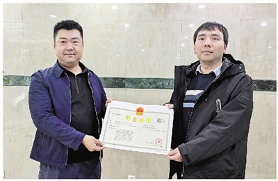 凯旋街道办事处副主任刘梦恒(右)将营业执照交给企业负责人。