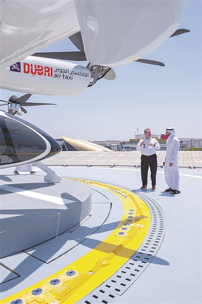 图为4月16日,在阿联酋迪拜,工作人员向迪拜王储谢赫哈姆丹·阿勒马克图姆(右)介绍空中出租车垂直起降场。