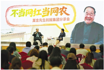 当天下午,莫言以“不当网红当网农”为主题,与杭报集团的媒体记者们进行了深入分享与互动,就文学创作、公益事业、媒体责任及国际传播等话题畅谈经验与心得。