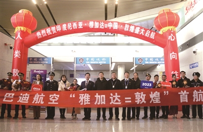 12月24日,由印尼巴迪航空公司执飞、搭乘133名游客的雅加达至甘肃敦煌的国际旅游包机首航航班顺利降落在敦煌莫高国际机场,这标志着雅加达至敦煌的国际旅游包机往返航线正式开通。这是在敦煌莫高国际机场,雅加达至敦煌首航航班机组人员与机场工作人员合影。
