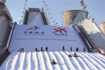 12月24日,第三届首钢园冰雪汇开幕,北京首钢滑雪大跳台再次成为大众冰雪乐园。首钢园冰雪汇是首钢园推动冬奥场馆可持续利用的冬季潮玩戏雪乐园。这是游客在首钢滑雪大跳台体验雪圈冲浪。