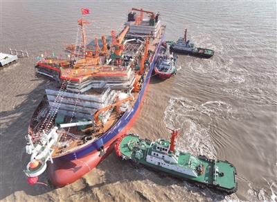 12月24日,国内首艘15000立方米舱容双燃料动力耙吸挖泥船“新海鲟”号在江苏启东正式下水。“新海鲟”号以LNG清洁能源为主要动力源。这是“新海鲟”号在启东顺利下水(无人机照片)。