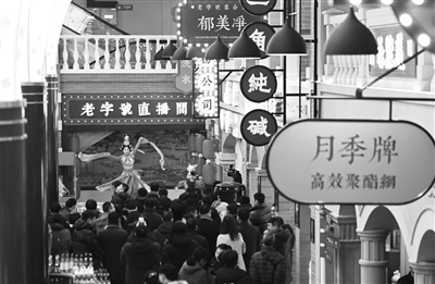 1月21日,天津市河西区的天津首家老字号集合店开业。汇集了桂发祥十八街麻花、狗不理、耳朵眼、果仁张、鸵鸟墨水等多家天津地方老字号品牌及上海大白兔、北京全聚德等外地老字号品牌,涵盖500余种特色产品,为消费者提供一站式购物体验。这是顾客在天津老字号集合店内观看演出。