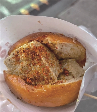 外面炸得很脆,内里却十足细嫩,如同会化开一般,口感极佳。还有酒酿馒头夹臭豆腐,出乎意料地好吃,整体是酥脆有层次的口感,一口香到心间。