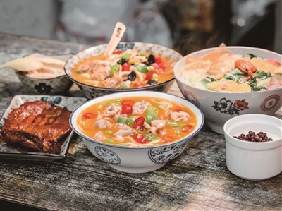 米线嫩滑,牛蛙、黄鱼等浇头铺展在细白的米线上,酱汁浓稠,吃起来香滑可口。店内米线口味多样,酸汤、清汤、三鲜皆有,再加上大排、千张包等杭州小吃,简简单单的美味,却令人们心心念念。