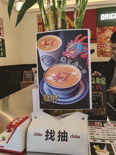 梦记的吧台上有“发财咖啡”的小牌子,配文是:“老板,来一杯发财”,咖啡的价格同样非常吉利——28.8元,老板说在1月上旬店里就上新了这款拿铁,目前卖得还不错,可以自选使用外带杯或者是店里的陶瓷杯。