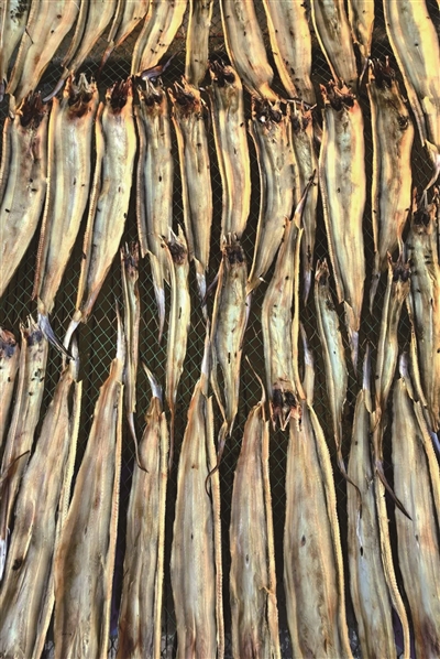 人们在各色海鱼中挑选肉质肥硕、脂肪饱满的,从背上剖开,去除内脏清洗干净后,平铺在专用于晒鲞的竹篾网上,海风、阳光和时间,如同配合默契的美食料理者,慢慢改变着鱼肉的状态,让它们从柔软变得紧实,蒸发掉鱼肉里的水分,也促使鱼肉里的一些营养物质发生变化,产生更加鲜美的味道。