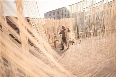 这个时节,台州的三门、仙居、临海等县市乡间,晒制垂面的景象就变得十分常见。垂面作为当地的传统粉食,是早年春节前后走亲访友必备的礼品。