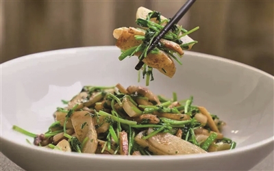 临海有道菜叫花草炒年糕,春季时特别受欢迎,这种纯手工打出来的年糕炒制起来最好吃,柔软Q弹,自带鲜味。“花草”就是春季时节临海乡间满田地长着的紫云英,取其嫩茎带叶炒入年糕中。