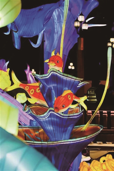 缤纷多彩的鱼群汇聚成游龙回旋之姿,游走在飞檐斗拱之间,将辛弃疾《青玉案·元夕》中所描绘的元夕灯会繁华之景,带到今时今日今宵。