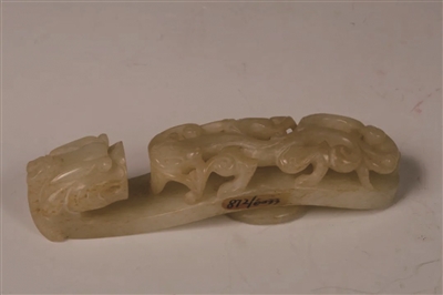 一端雕龙首为钩,龙头微昂,前额稍隆起,眼外凸。从侧面看,龙嘴张口露齿,头上两角伸至颈部。钩身上凸雕一螭,螭站立于钩面,与龙首相对,呈腾空之势。背部刻有一条脊线,歧尾分叉回卷。带钩背面凸雕一圆形纽。整件器物造型优美、技艺高超、玲珑奇巧、颇有神韵。