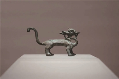 另外,展出的还有金龙,外形继承了典型的唐代金龙样式。它头小颈长,长尾,身形矫健有力,背甲腹鳞刻画清晰,形象与蛇相近,印证了伏羲和女娲的“蛇身”是龙最原始形态的说法。