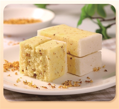 以大米粉、糯米粉及小米粉为主,精选芡实、桂花、奶粉、海藻糖、植物油为辅料,经过10多道工序加工而成。口感软糯细腻,里面还夹杂了桂花的清香,并且米香味浓郁,带着丝丝微甜,越嚼越香。