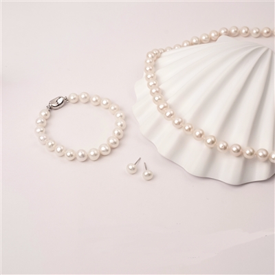 欧诗漫洛华三件套,包括手链:淡水/白色/无核,8-9mm/近圆形/17cm长;经典款淡水无核珍珠全珠项链:淡水/白色/无核,8-9mm/近圆形/45cm长;耳钉:淡水/白色/无核,7-8mm/扁圆形(馒头形)。优雅、从容,无论送给妈妈还是犒赏自己,都非常合适。