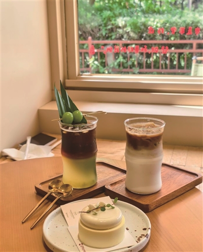 店内最惊艳的是临湖廊道:坐在藤编摇椅上,眼前是小南湖的睡莲与鸳鸯,左侧可见苏堤六桥如长虹卧波。招牌“观·花港”特调将龙井茶汤与冷萃咖啡分层注入,顶部浮着可食用金箔,搅拌后如西湖晚霞般绚烂。搭配“壶碟会”茶点(龙井酥配桂花蜜饯),重现马一浮先生与友人“一壶两杯,心照不宣”的雅趣。