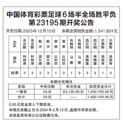 中国体育彩票足球6场半全场胜平负 第23195期开奖公告