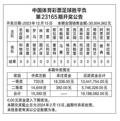 中国体育彩票足球胜平负 第23165期开奖公告