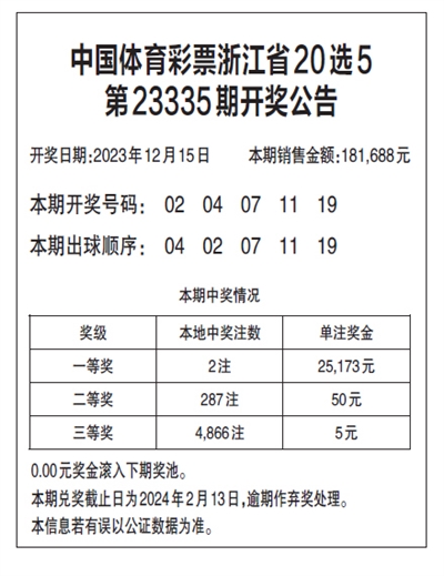 中国体育彩票浙江省20选5 第23335期开奖公告
