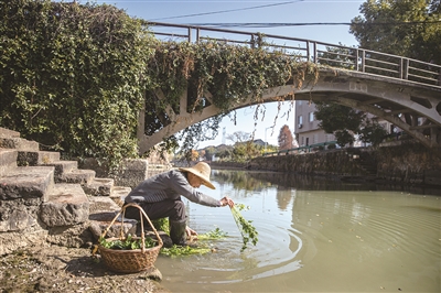 在吴山大酒店吃完饭,我们往老街方向走,在河边的埠头遇见了正在洗菜的老陈。