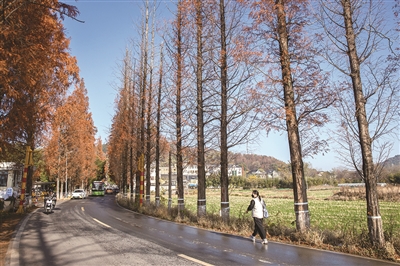 如果坐地铁3号线,终点站就是吴山前村站。从武林广场出发,坐地铁到这里大约需要50分钟,出站便可以看到一派田园风光和一条种满水杉树的小路,沿着小路向北走一小段,就到了吴山前村的“中心地带”,后方即是吴山。