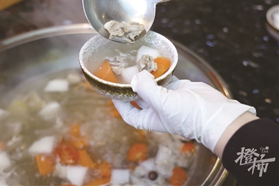 饭店给环卫工人们准备的是“羊蝎子+羊排”的羊肉火锅,一般每次活动都会来15位到20位环卫工人,而一锅羊肉汤有四十多碗的量,每次大家吃好会有剩余,饭店建议环卫工人们用保温盒打包带回家,第二天早上他们还能当早餐或煮面条。吃过羊肉羊汤的环卫师傅都说好吃。