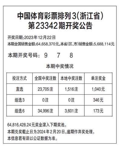 中国体育彩票排列3(浙江省) 第23342期开奖公告