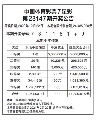 中国体育彩票7星彩 第23147期开奖公告