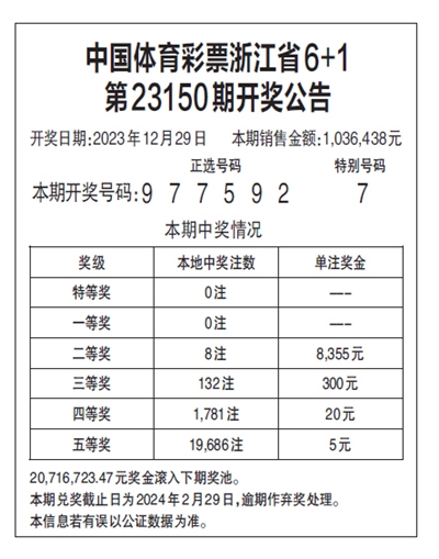 中国体育彩票浙江省6+1 第23150期开奖公告