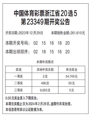 中国体育彩票浙江省20选5 第23349期开奖公告