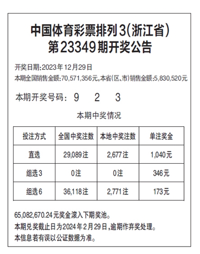 中国体育彩票排列3(浙江省) 第23349期开奖公告