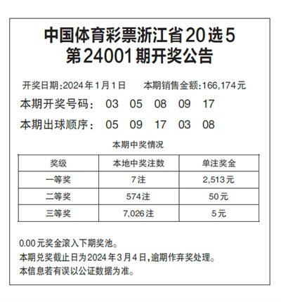 中国体育彩票浙江省20选5 第24001期开奖公告